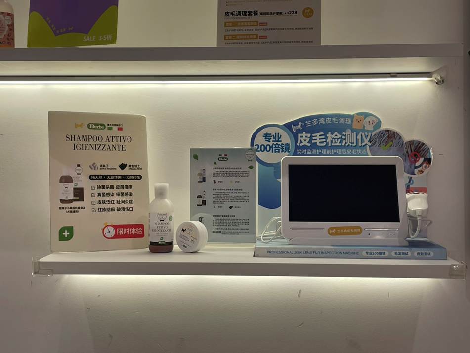 當店家發現狗貓的皮膚毛髮出現問題時,必然會及時告知飼主,但此舉經常引起對方質疑、反而誤以為店家信口開河、只是想讓顧客多花冤枉錢,為了避免真心換絕情、甚至引起無謂的糾紛;「蘭多灣」再次領先同業,斥資添購「皮毛檢測儀」,以真實呈現狗貓皮毛狀況,方能說服飼主並著手改善。(照片二)