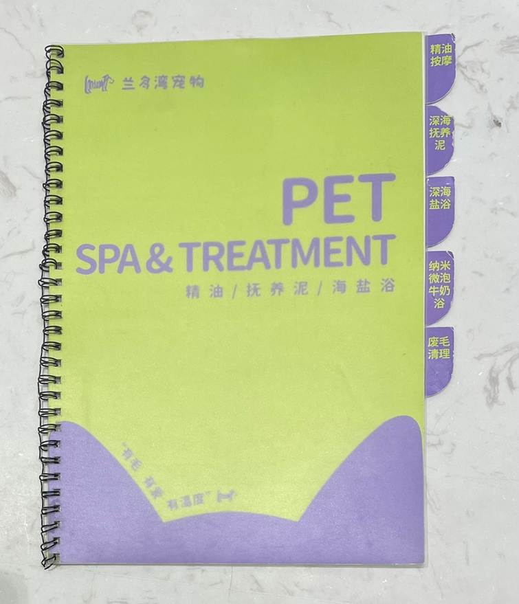 「蘭多灣」的櫃台上擺放了數本手冊,逐一針對該店所提供的各種「加值服務」詳加說明,讓飼主透過圖片和文字充分瞭解其原理功效,以避免口頭介紹不夠清楚而產生爭議與誤會;例如:來自日本某品牌的精油按摩、深海撫養泥、深海浴鹽、奈米微泡牛奶浴、廢毛清理等針對皮膚毛髮的加值服務。(照片三)