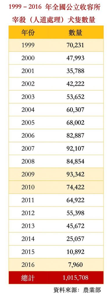 從官方公立收容所資料核對可以清楚看見,在零撲殺政策正式實施之前,台灣其實已經歷過一段長達十八年的宰殺年代。自1999年至2016年,全國公立收容所因政策而被執行「宰殺(安樂死)」的犬隻,累計高達1,015,708隻,平均每年超過5.6萬隻。這並非零星事件,而是一整個制度選擇所造成的結果。