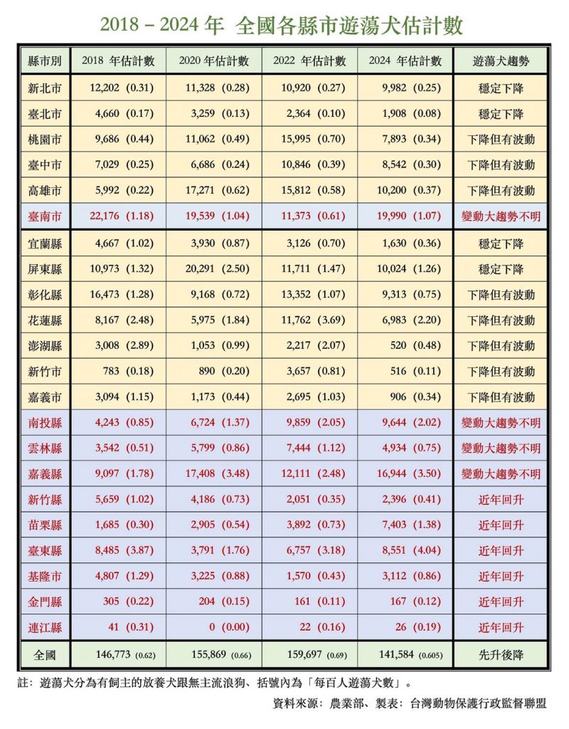 更關鍵的是,當數據拆解到縣市層級後,差異非常清楚:落實源頭管理與結紮政策的縣市,流浪狗(遊蕩犬)數量持續下降;長期消極、放任違規的縣市,問題則反覆累積並集中爆發。這清楚說明,宰殺並不是結果的原因,地方治理能力才是關鍵。