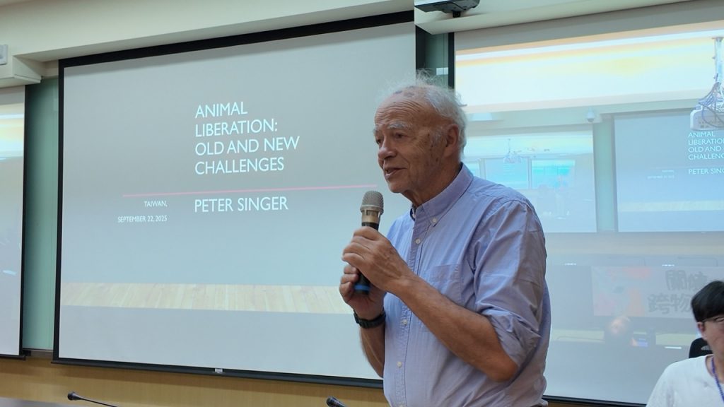 辛格教授以「動物解放五十年:舊挑戰與新挑戰」為題發表演講。他回顧1975年著書之初的挑戰,包括社會對動物福利的忽視、工廠化農場的隱匿、蔬食運動的邊緣化,以及人類中心主義的根深觀念。他指出,「物種歧視」概念正是回應這些挑戰的核心。