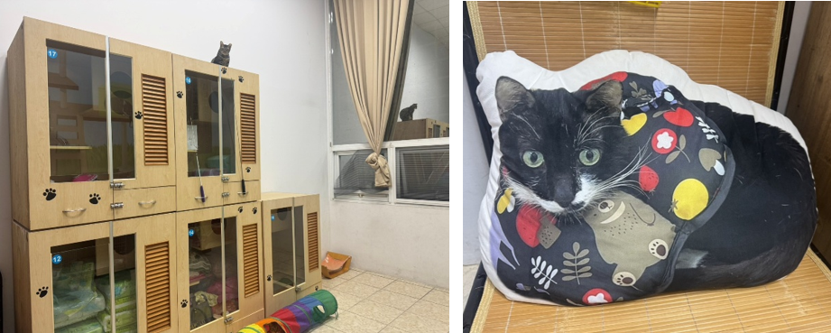 五中社區發展協會裡的貓房,所有設備都是各方捐贈的二手物資,包括木質貓窩;而貓型抱枕是「老賓」往生後,特別訂製的紀念品。 崔美瑛/提供