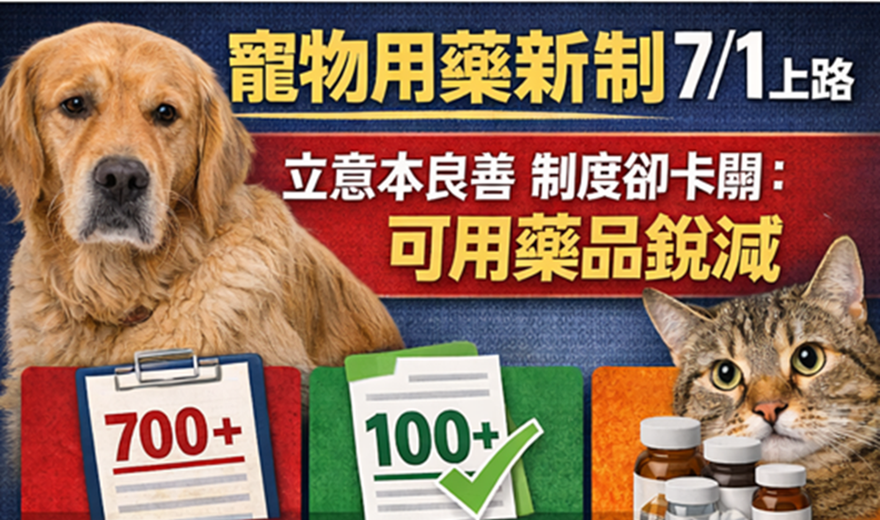 2024年,農業部與衛福部共同發布《人用藥品用於犬貓及非經濟動物之使用管理辦法》,並設兩年緩衝期,訂於2026年7月1日起正式實施,目標是讓寵物使用人藥制度化與可追蹤。