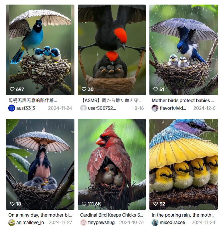 研究特別剖析一類「母愛滿滿」的熱門模板:AI把不同鳥種全寫成「鳥媽媽展翅為雛鳥擋雨」,網友往往直誇「真母愛」。問題在於,這種敘事把人類的家庭情感直接投射到野生動物身上。然而,約九成鳥種的雄鳥也會參與育雛,而許多爬行類、兩棲類和魚類則幾乎沒有親代撫育,與「母愛宇宙」的單一路線完全不同。 事實上,只要在社群平台以「鳥媽媽擋雨」為關鍵字搜尋,現在能找到不少版本的AI合成影像;台灣事實查核與鳥會專家也已點名這類影片為AI生成、姿態與巢位設計不合生態學常識。