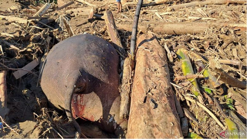 在熱帶氣旋過後,一頭重達數噸的蘇門答臘象屍體被發現卡在淤泥中。圖片來源/ANTARA