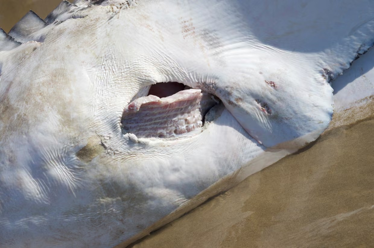 為了解開這個謎團,湯納和她的同事解剖了四隻死亡大白鯊,很快,他們就發現這些屍體有相同傷口:所有大白鯊的胸帶(pectoral girdle,位於鰓後方)都被撕裂,傷口精準得如同外科手術,其中兩具屍體上還有明顯的耙痕。最引人注目的是,所有大白鯊的肝臟都不見了。